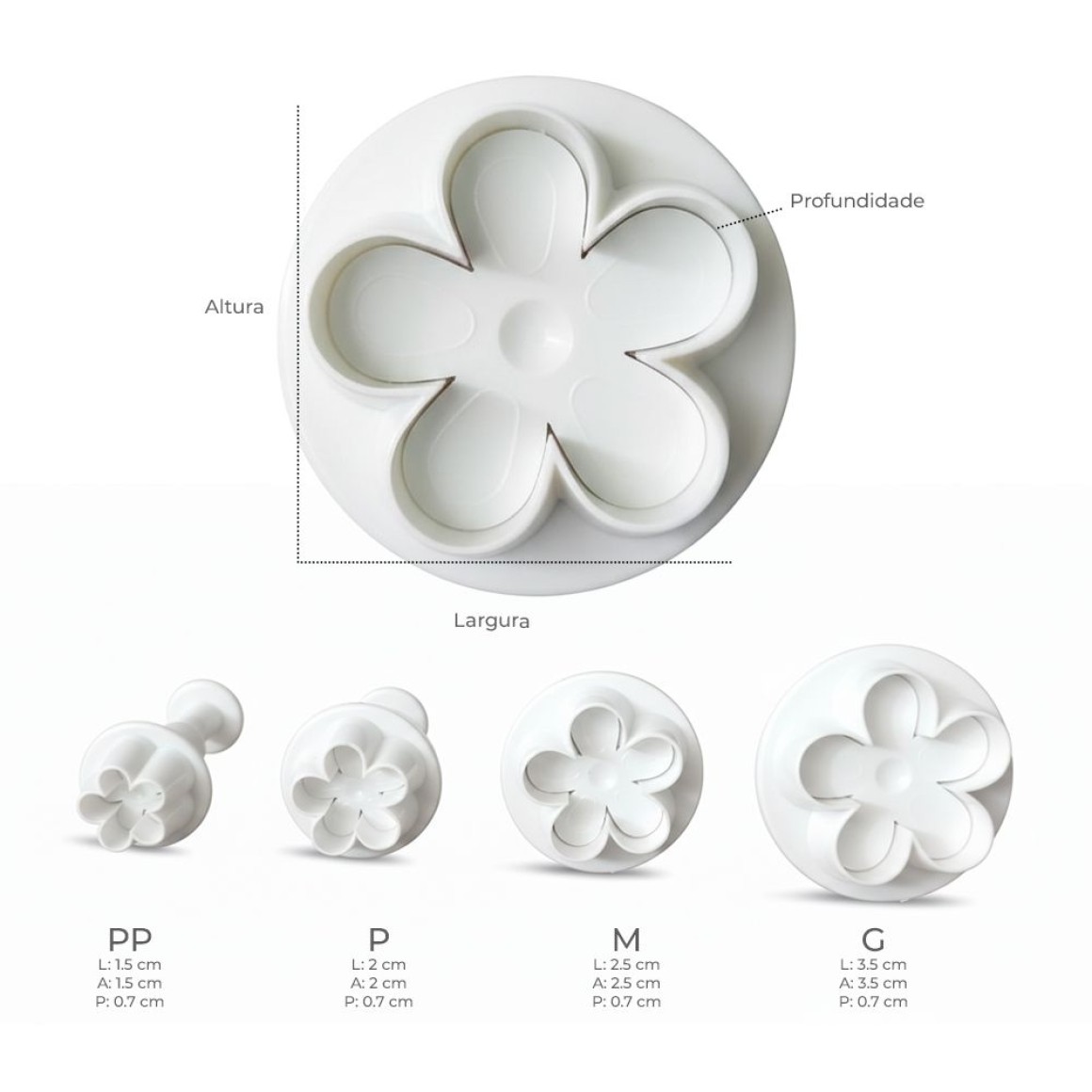 O kit inclui 4 tamanhos diferentes (PP, P, M e G), permitindo criar composições lindas e criativas.